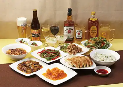 餃子3種(焼き・揚げ・水)、春野菜と海老の塩炒め、マグロのカルパッチョ、フカヒレ煮込み、しらす炒飯 他全8品 + 飲み放題(90分)
