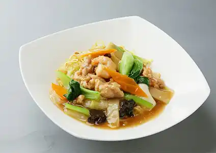 野菜や豚肉がたっぷり入った食べ応えのある一品。こんがり焼きあがった麺に熱々の餡をよく絡めてお召し上がりください。