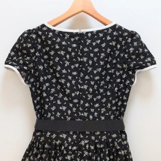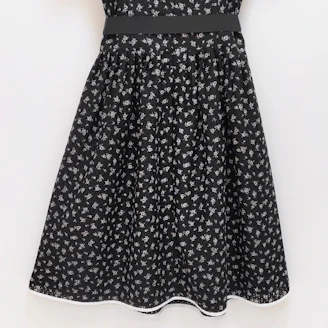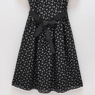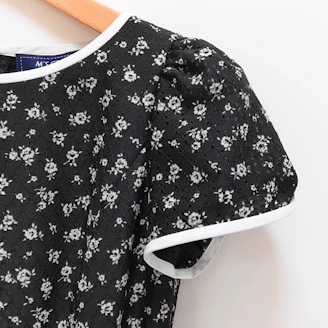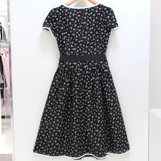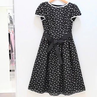 レーシーな生地に小花柄をプリントしたワンピースは、エムズの王道シルエットでパイピングの配色切り替えで爽やかな印象となります。