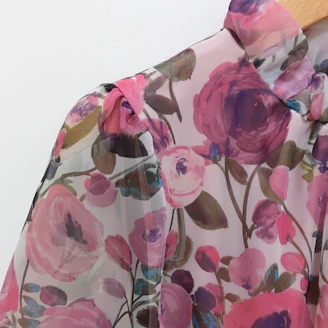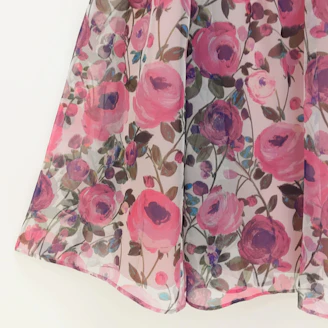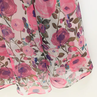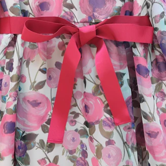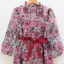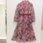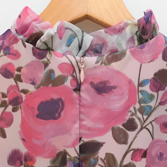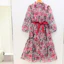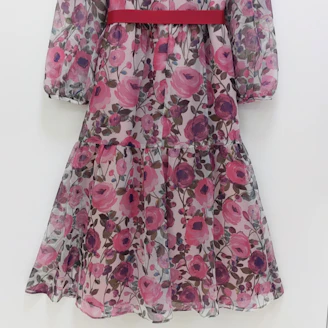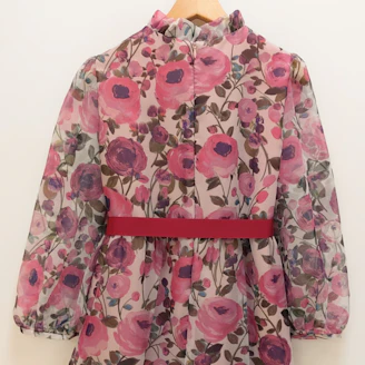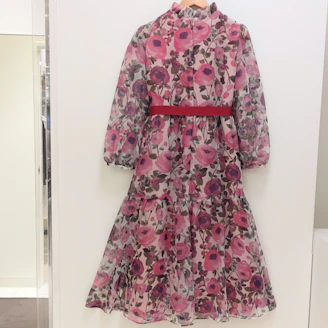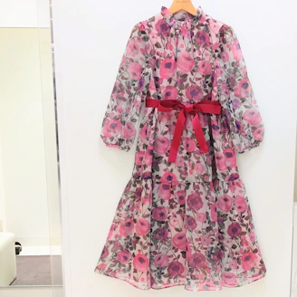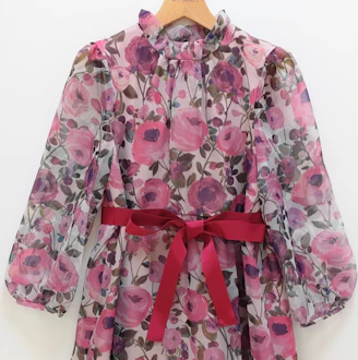 高めにとったウエストラインのシルエットでスタイルアップ効果のあるシフォンのドレスは、フリルをあしらった襟元とグログランリボンですっきりとした印象となります。