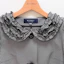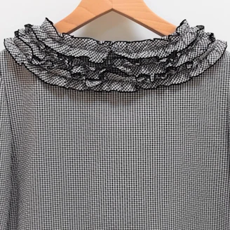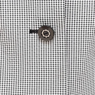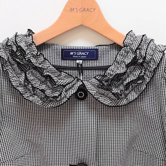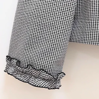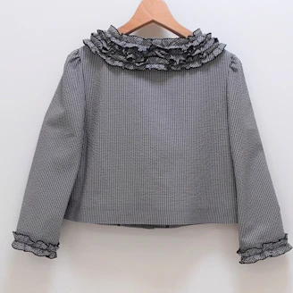 ギンガムチェックのジャケットは、襟のフリルがポイントとなっており、ボタンもエムズらしくお花をモチーフにしております。