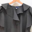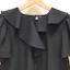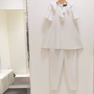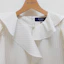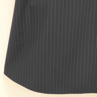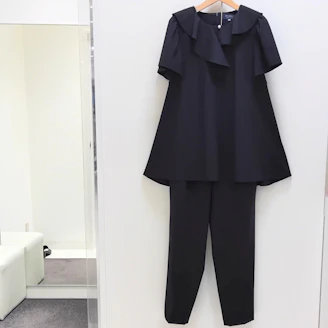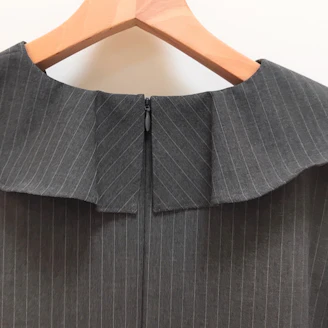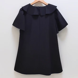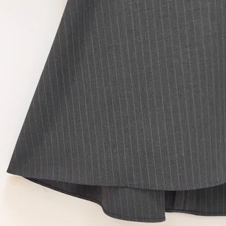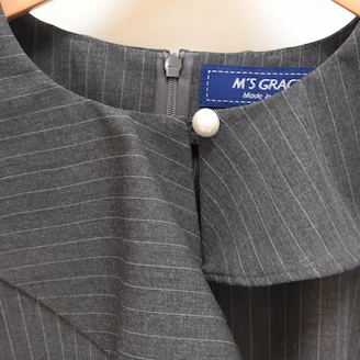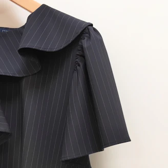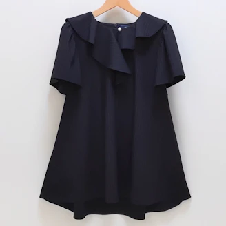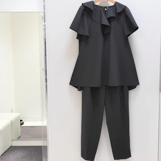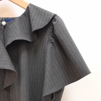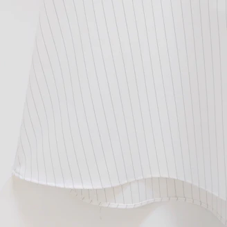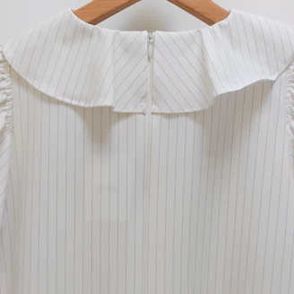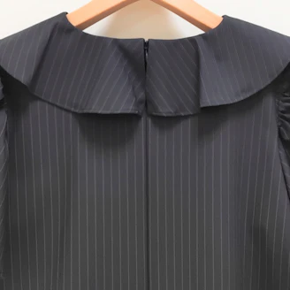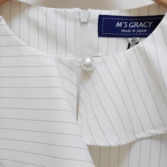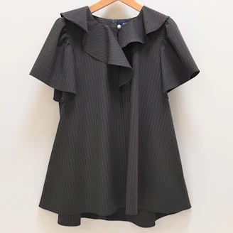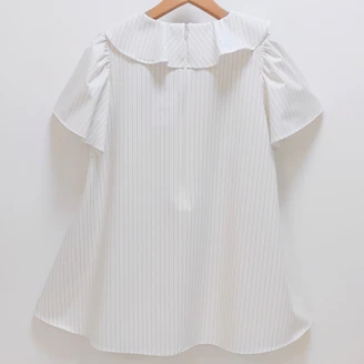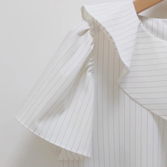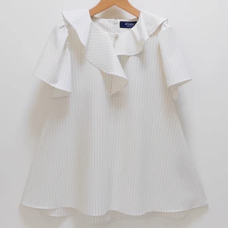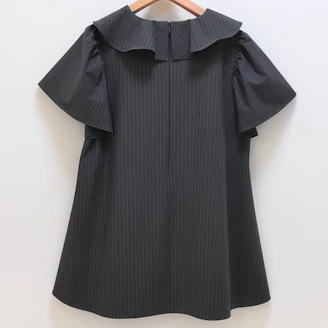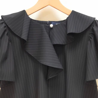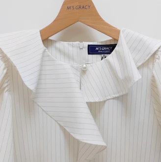 襟元のフリルとパールモチーフが華やかなピンストライプ柄のブラウスは、Aラインシルエットでヒップラインをカバーしてくれる着丈なのも嬉しいポイントです。