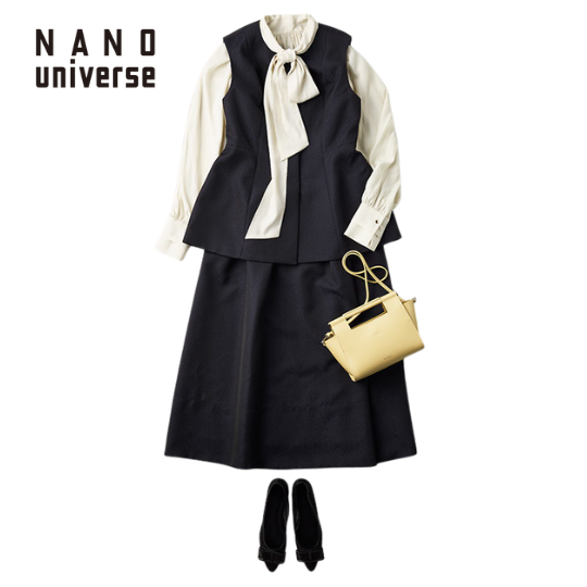 紺のセットアップに白のリボンタイブラウスを合わせた、 きちんと感のある装い。