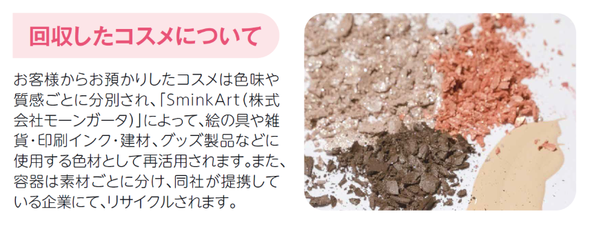 本取り組みでは、廃棄化粧品の再利用に取り組む SminkArt(スミンクアート)〔株式会社モーンガータ〕にご協力いただき、回収したコスメの一部をアップサイクルへとつなげています。