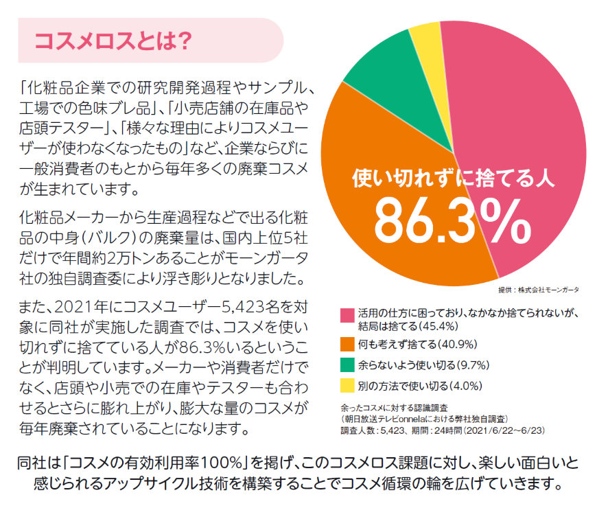 コスメは日常的に使用される一方で、使い切る前に新しい製品へと移行することや、容器の構造上の理由から中身が残ってしまうことにより、“コスメロス(使いきれずに廃棄される化粧品)”が生まれやすい分野です。