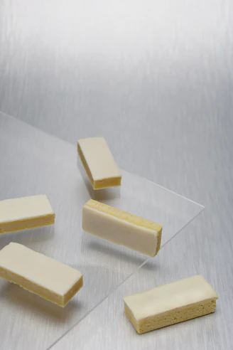 控えめで優しいバターが香る、雪のように真っ白なホワイトチョコレートをのせた、しっとりとした食感です。