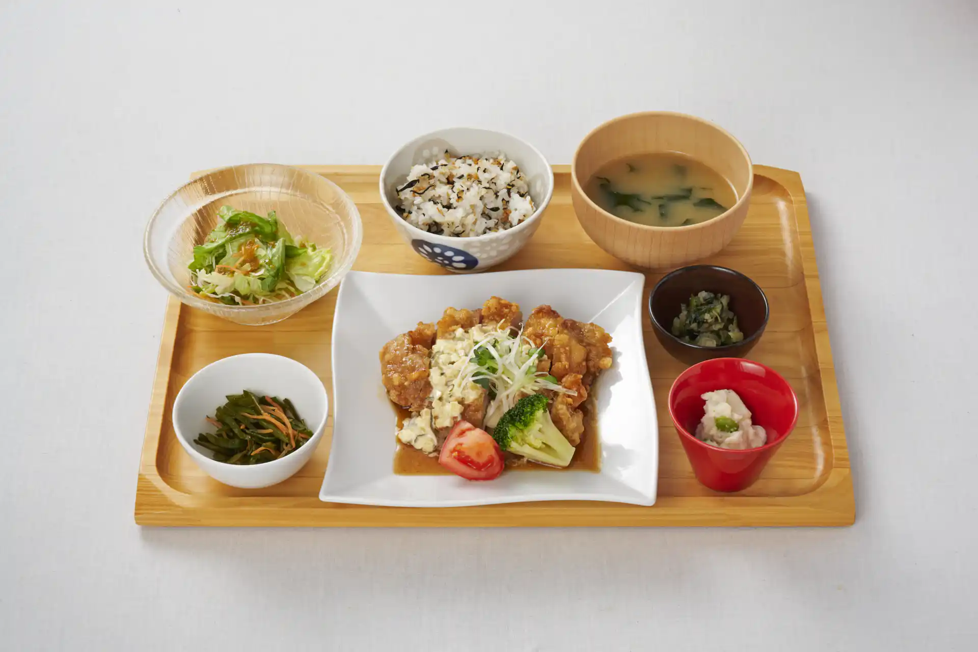 超定番!おぼんdeごはんといったらこれ!鶏もも肉をしょうがやにんにくの入った醤油だれに漬けこんで唐揚げにしました。白味噌としば漬けの入ったタルタルが人気の秘密。