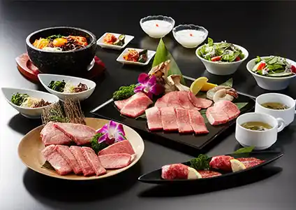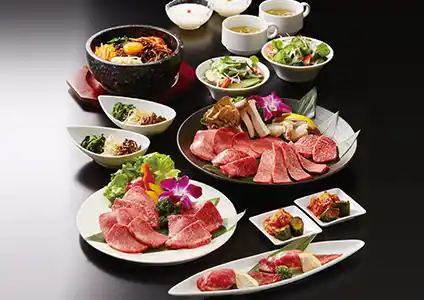 前菜、サラダ、特上牛タン塩、特選和牛一頭六種、海老、特選和牛にぎり、選べるお食事、デザート