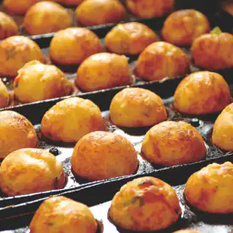 “表面はこんがり、中身はふんわり”の食感にこだわり続けて30余年。生地には三種類の小麦粉と山芋の粉をブレンドしたものを使い、大粒のたこや具と混ぜ合わせ、職人がひとつひとつ丁寧に焼き上げています。