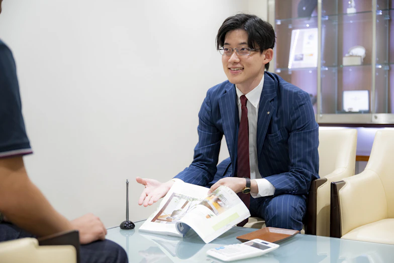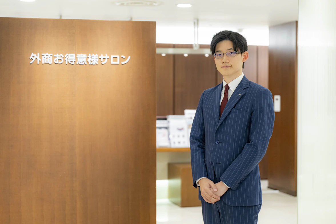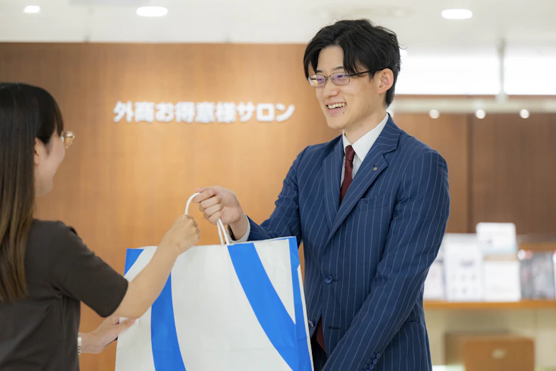 現在は、お得意様部 にて、ゴールドカードを所持されているお客様を対象とした外商営業を担当しています。お客様のご自宅や会社をご訪問して生活の質を豊かにするようなご提案をしたり、外商イベント時にご案内したりする仕事が中心です。