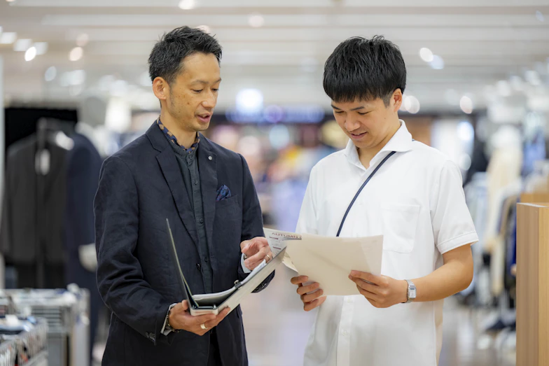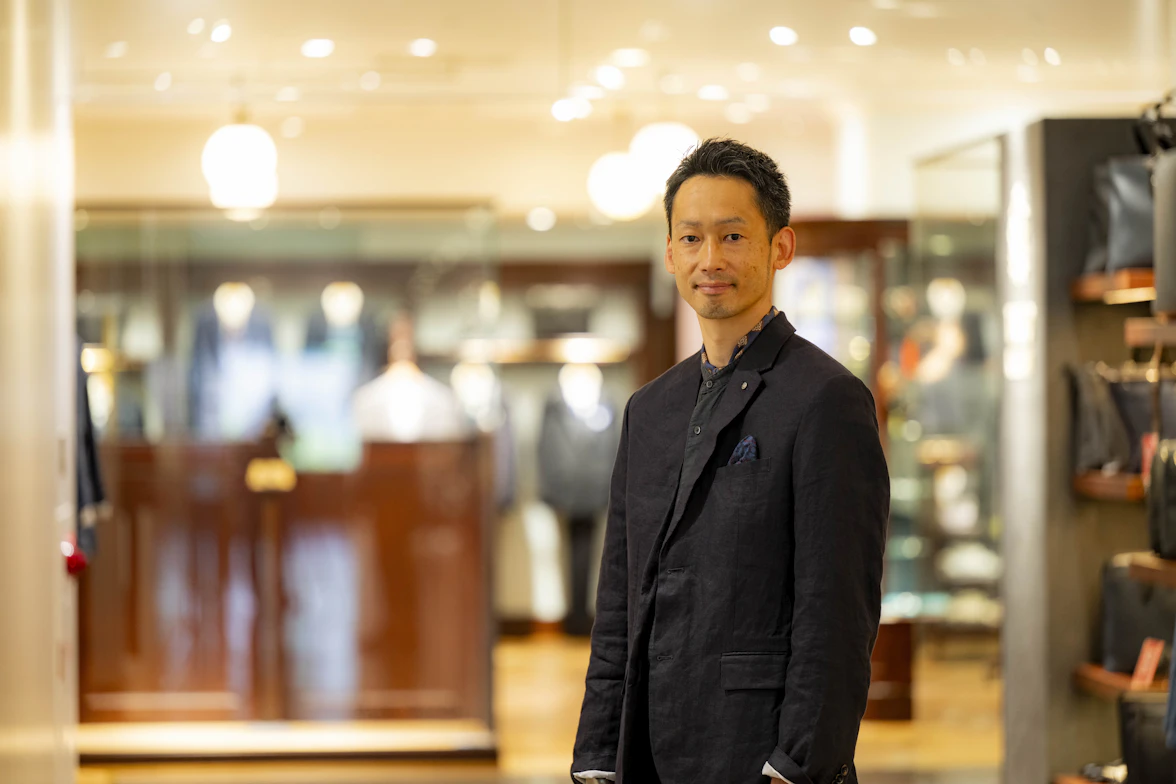 入社から8年、総務に在籍したあと、2025年3月に営業部に異動となりました。現在は紳士洋品・紳士こども服・玩具のフロアを担当するセールスマネージャーとして、売場全体の運営や数値管理を行っています。
