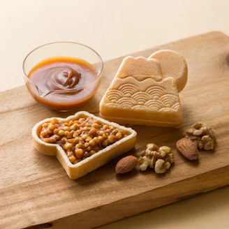 パリパリの新食感!ミルキーで香ばしいキャラメルに、クルミ、アーモンド、あられ、刻んだオレンジピールを加えもなか皮に詰めました。