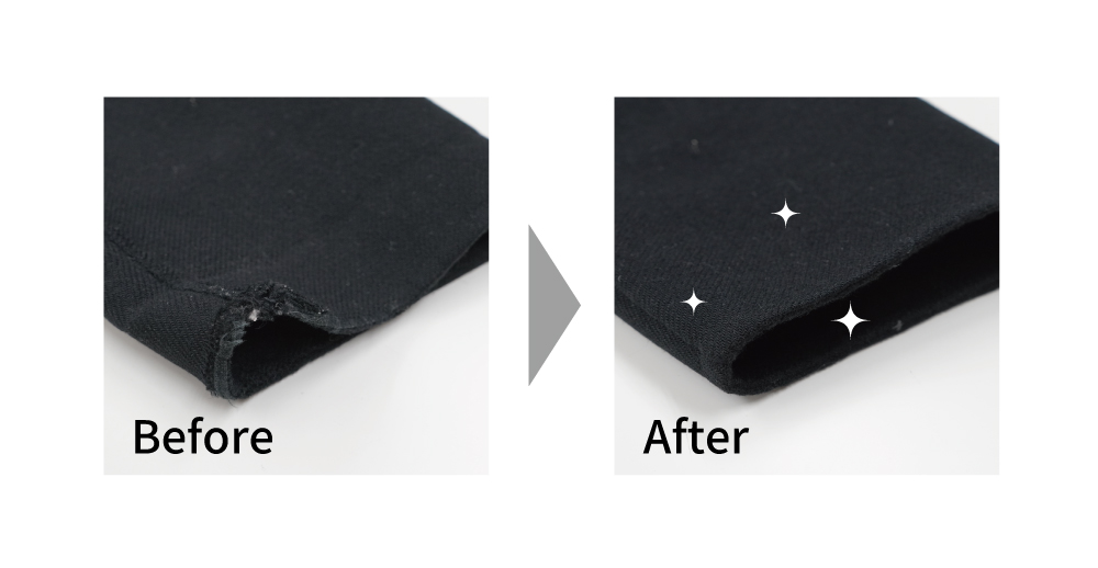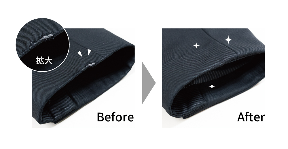 当店では、擦り切れや破れ部分を中に縫い込んでお直しいたします。少し袖丈が短くなりますが、傷んでいた部分は中に隠れて見えなくなります。