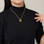 白蝶貝がゴールドカラーに共鳴し温かみのある光沢をたたえ、胸元で上品な存在感を放ちます。