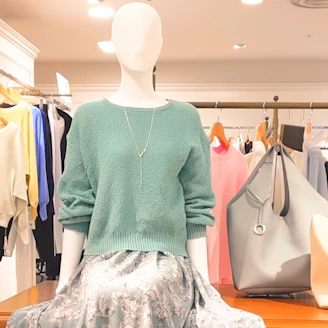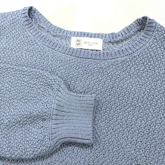 ふくらみのあるポリエステルのリリヤーン糸を使い、鹿の子編みで表面感を出しました。編み地の効果でシワも目立たず、イージーケアな素材も魅力。