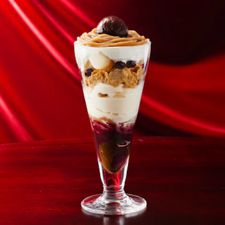 コクと甘味のある渋皮栗あんにカシスの華やかな香りが加わり、パフェ全体を軽やかな味わいに仕上げています。