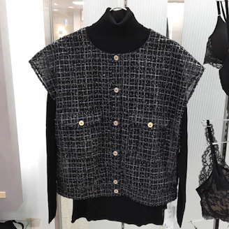 レースは、ラメやグラデーションの糸が交差するツイードのデザインをあしらっています。