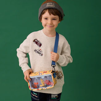 いろんな乗り物の総柄が個性的な、推し活にぴったりのショルダーバッグです。