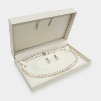 ネックレスは人気の8mm珠、イヤリングはワンサイズアップの9mm珠を使用。イヤリングをワンサイズ上げることでスタイルアップ効果があり、お洒落なパールスタイルを完成させます。フォーマルシーンはもちろん、ドレスアップ・デイリーにと、オールマイティーに活躍してくれます。