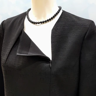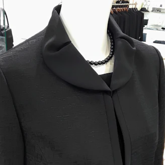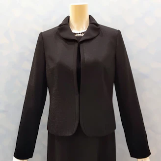 無地切り替えとショールカラーのタックがスッキリとした印象を与え、体型を自然にカバーします。