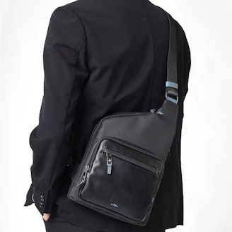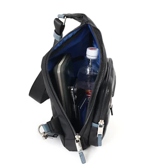 ブルーカラーのポイント使いがシンプルながらもデザインにアクセントを加えています。カジュアル、ジャケパンどちらのスタイルにもお使いいただけます。お財布、スマホなど日用品が収まるお出かけにちょうど良いバッグです。