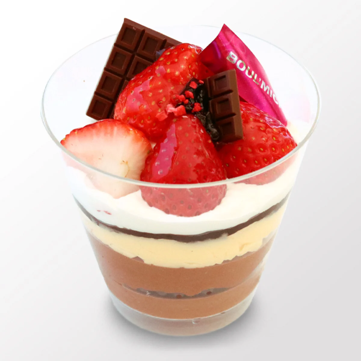 チョコレートプリンとほんのり甘酸っぱいベリーチョコレートムースのパフェ。人気のパフェシリーズです。