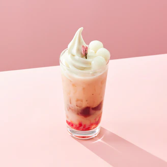 角切りの苺が食感・味わいのアクセントに。トップにのせたソフトクリームが溶けていくことでラテのような味わいへと変化します。