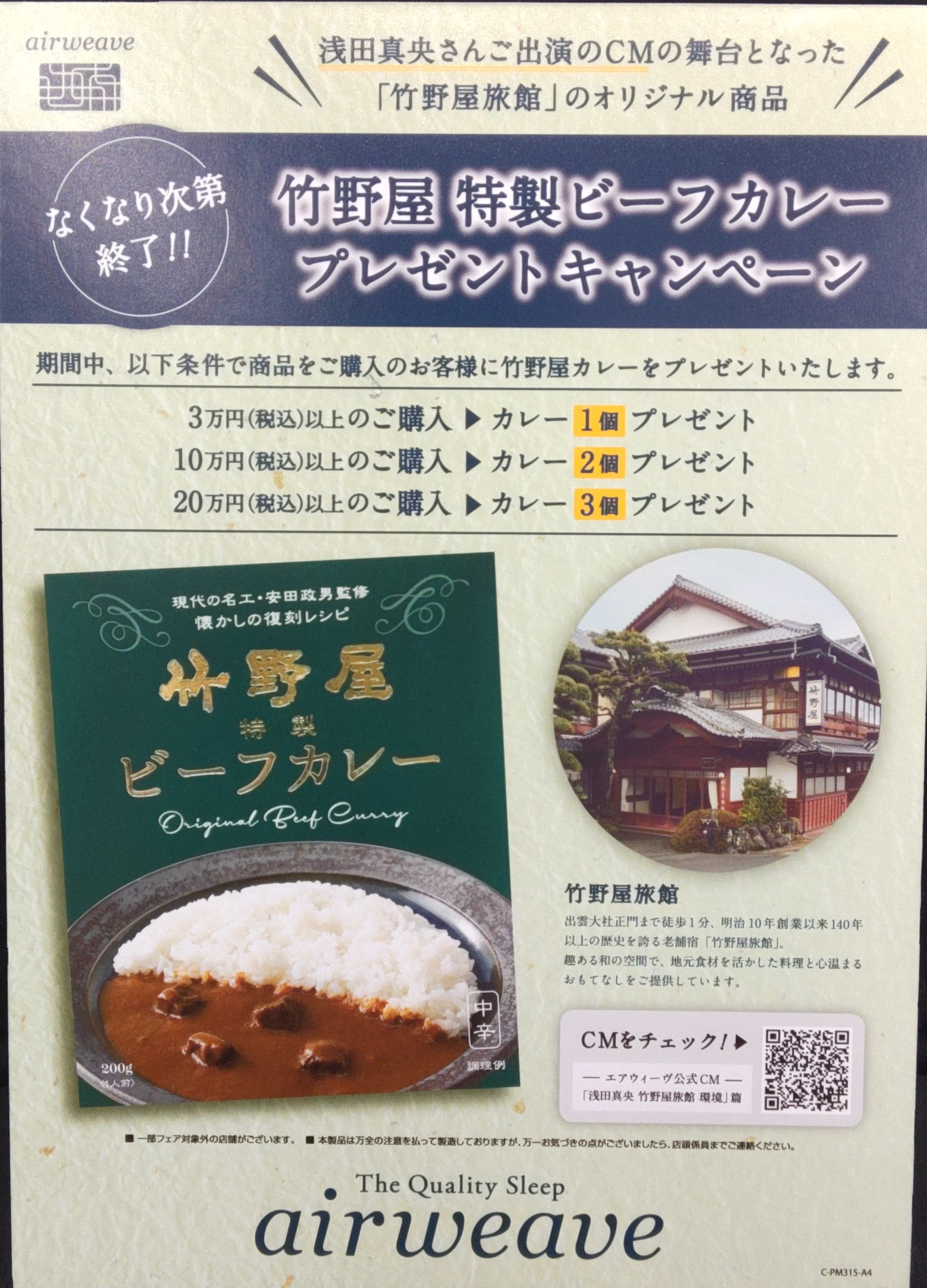 是非この機会にエアウィーヴで竹野屋旅館の寝心地を毎日お家でも体感いただき、美味しいカレーでパワーをつけ残暑を乗り切りましょう😃