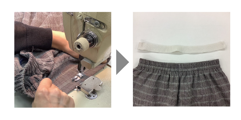 ご自身でゴムが入れ替えできないようなデザイン(ゴムの通し口/取替口がない)や、ゴムがねじれないように上からステッチをかけている商品、ゴムの一部が本体に直接縫い付けられているものなど、交換が難しいお洋服もデザイン元通りにお直しできますので商品をお持ちになってお気軽にご相談ください。