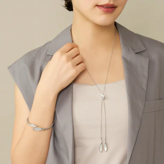 流れるような柔らかなラインと白蝶貝のゆらめく虹彩が美しく溶け合うラリエットネックレス。