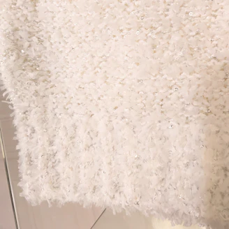 テープ状のナイロンの糸とスパンコールの糸を引き揃えた素材にスパンコールを加えて織りこんだファンシーツィードライクな上品な編地です。