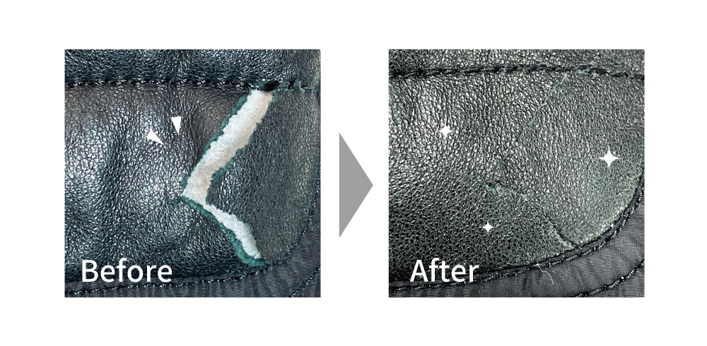 引っかけて革が剥がれたり転んで破れたレザーのお洋服も、修理跡は残りますが、お直し可能です。(裏側に革を当てて、接着して補修します。)