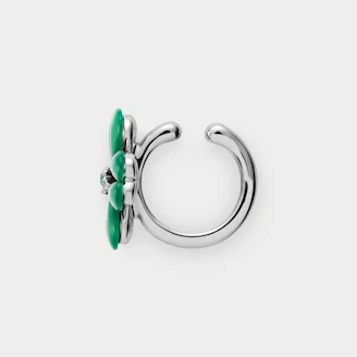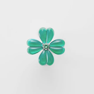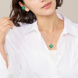 グリーンカルセドニーの鮮やかで透明感のあるグリーンと、愛らしいクローバーのフォルムがマッチした、ノーブルな魅力溢れるデザイン。