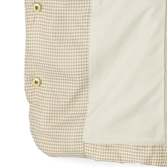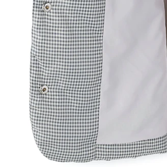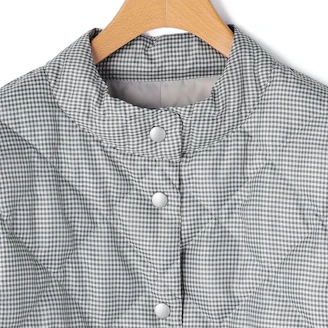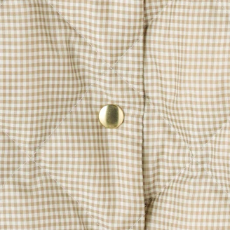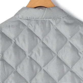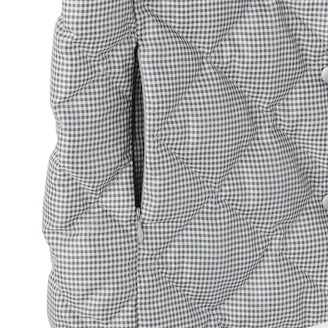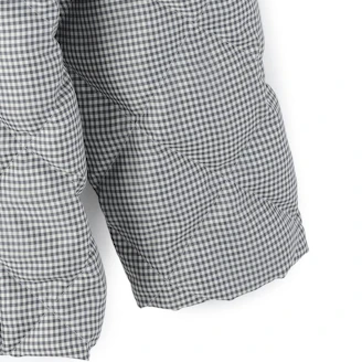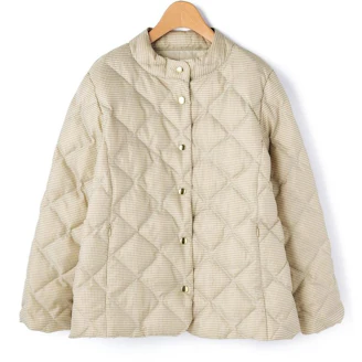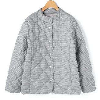 ギンガムチェックにダイヤ柄のダウンはエレガントなムードで着こなしやすくストレートフィットなシルエットが魅力。