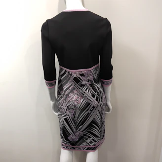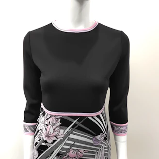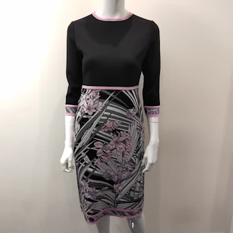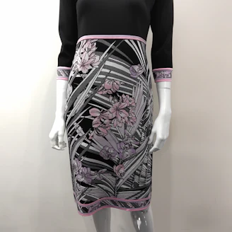 上質なブラックをベースに、裾の華やかなフラワープリントふぁ映えるワンピースです。首元とウエストのピンクラインがアクセントになり、スッキリと女性らしい印象に仕上がります。