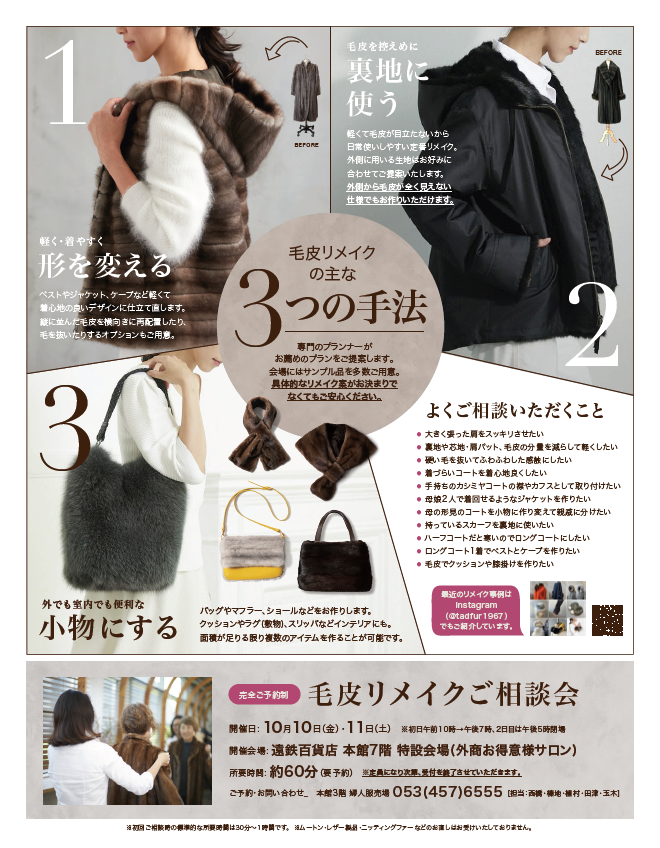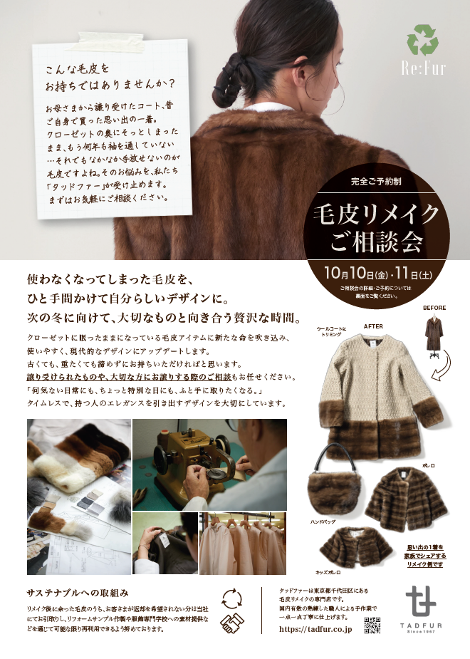 10月10日(金)・11日(土)の2日間、本館7階特設会場にて「毛皮リメイクご相談会」が実施されます。毛皮リメイク専門店「タッドファー」と連携し、熟練の職人が一点一点丁寧に仕上げる完全予約制のご相談会です。