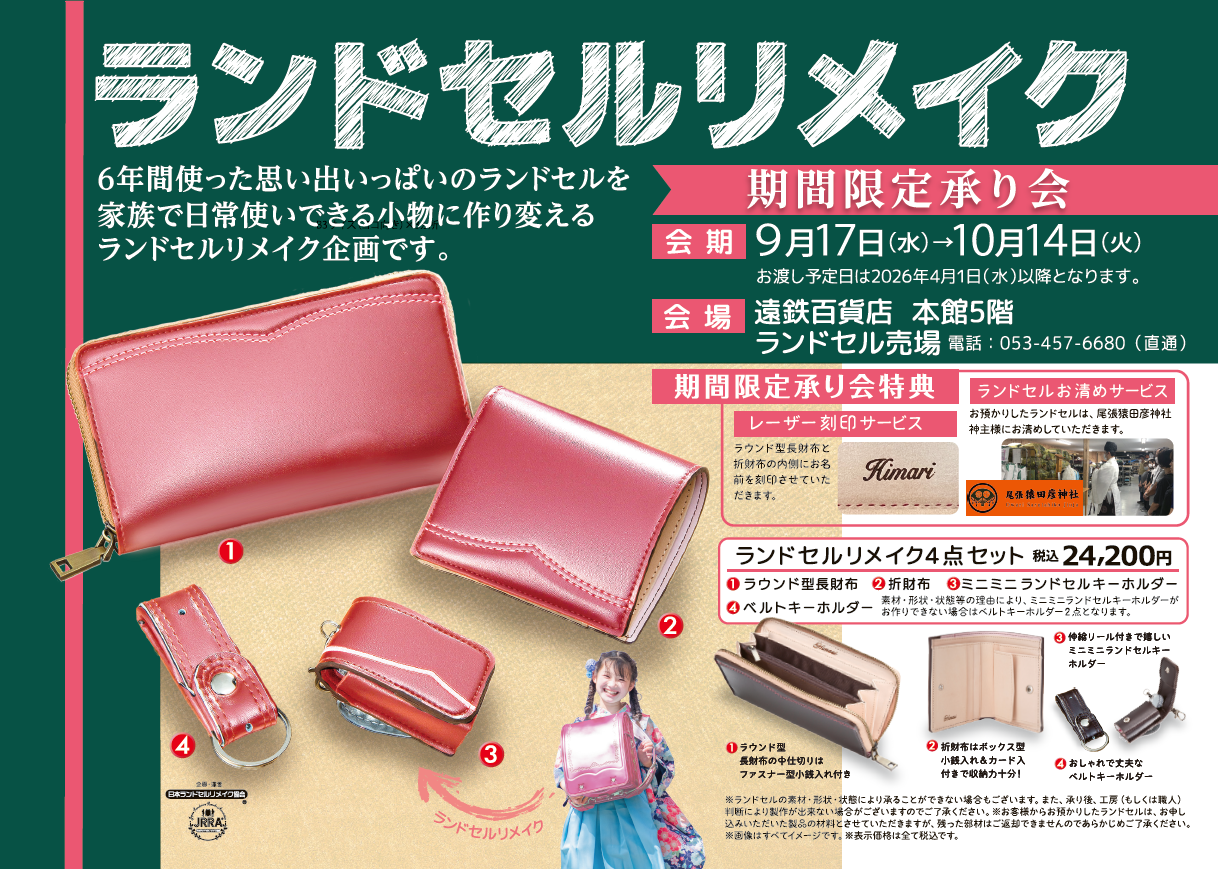続いてご紹介するのは、「ランドセルリメイク 期間限定承り会」です。2025年9月17日(水)から10月14日(火)まで、本館5階ランドセルにて承ります。小学校6年間を共に過ごしたランドセルを、財布やキーホルダーなどの日常小物に作り変える企画です。